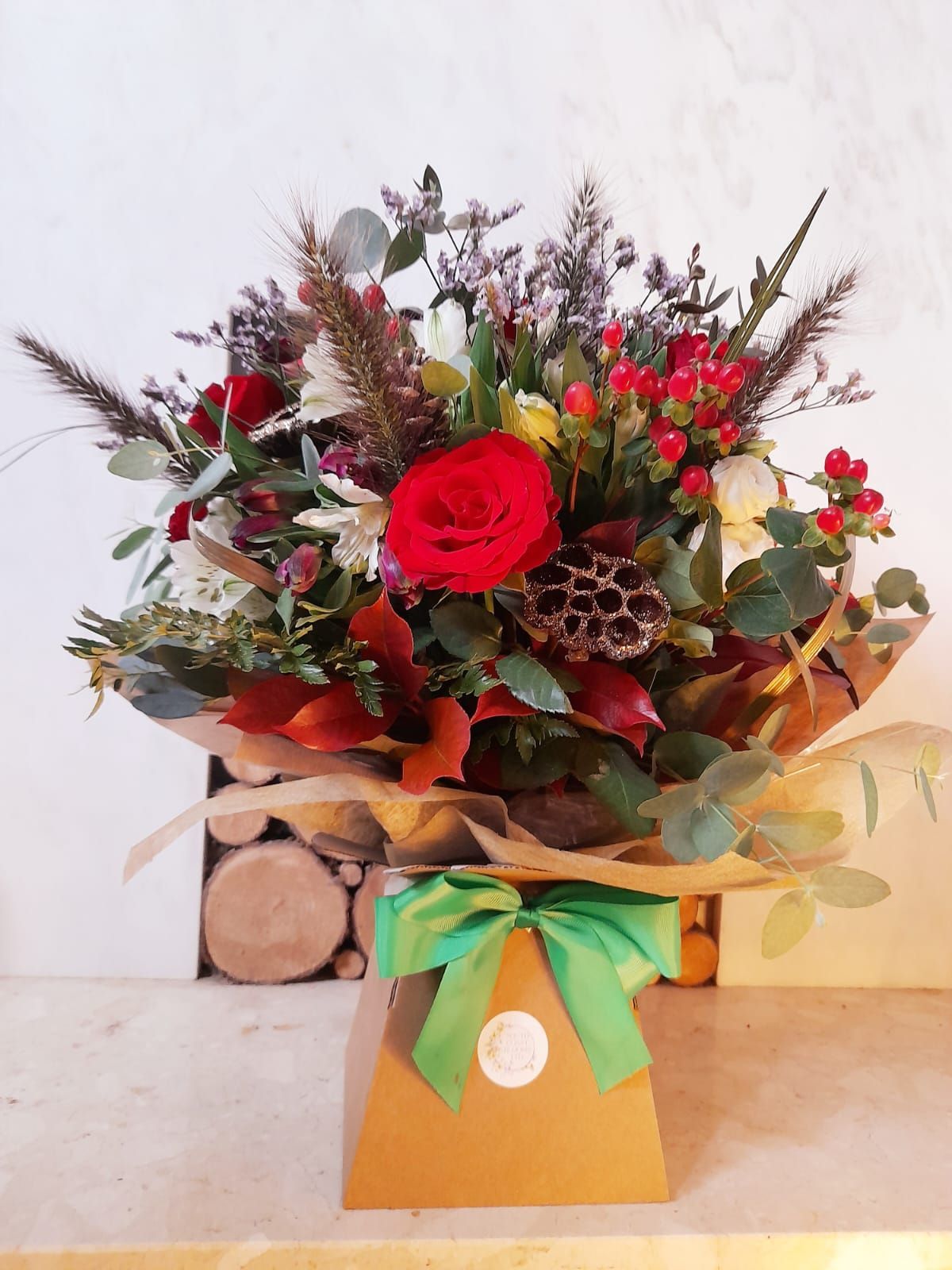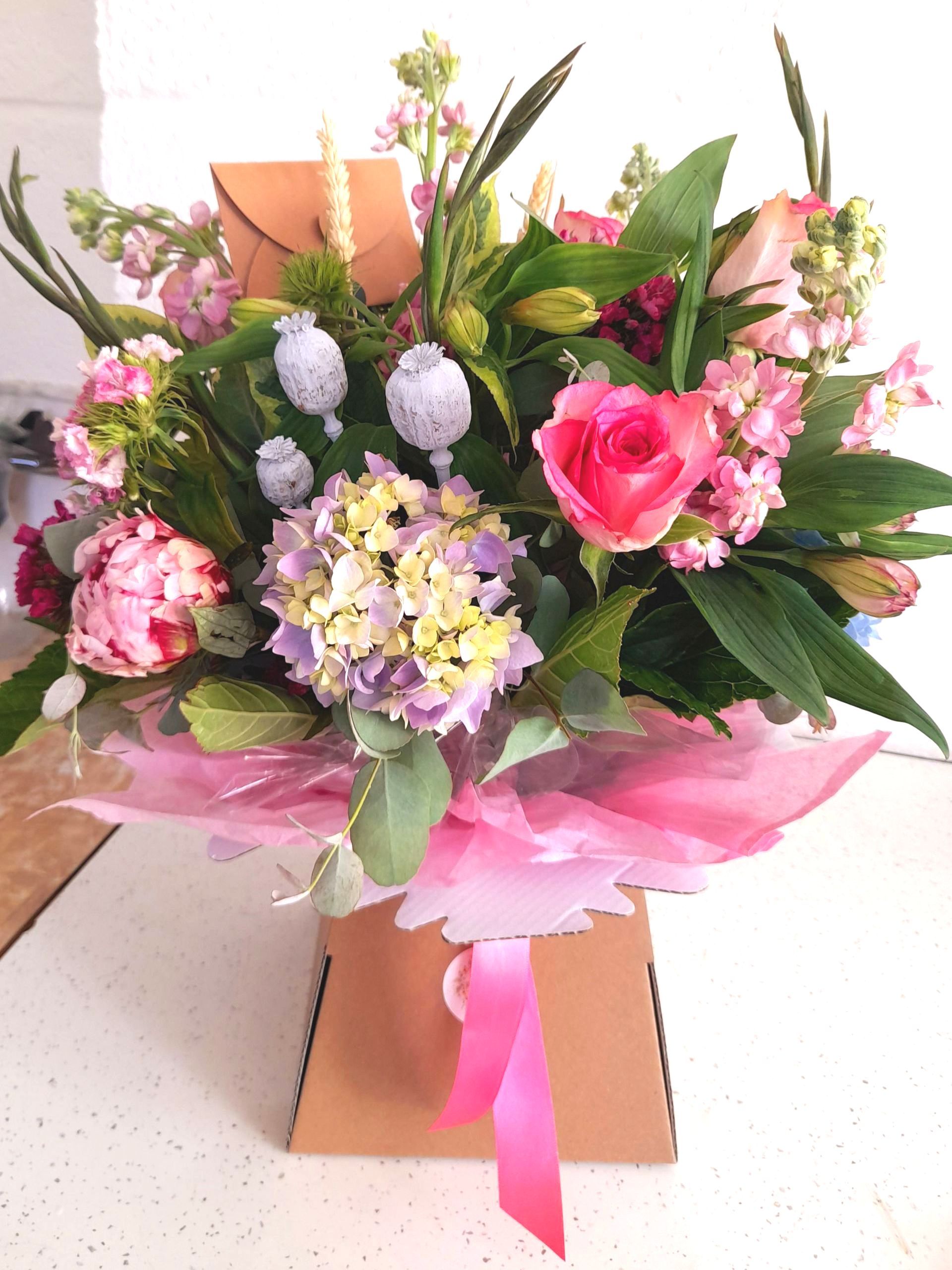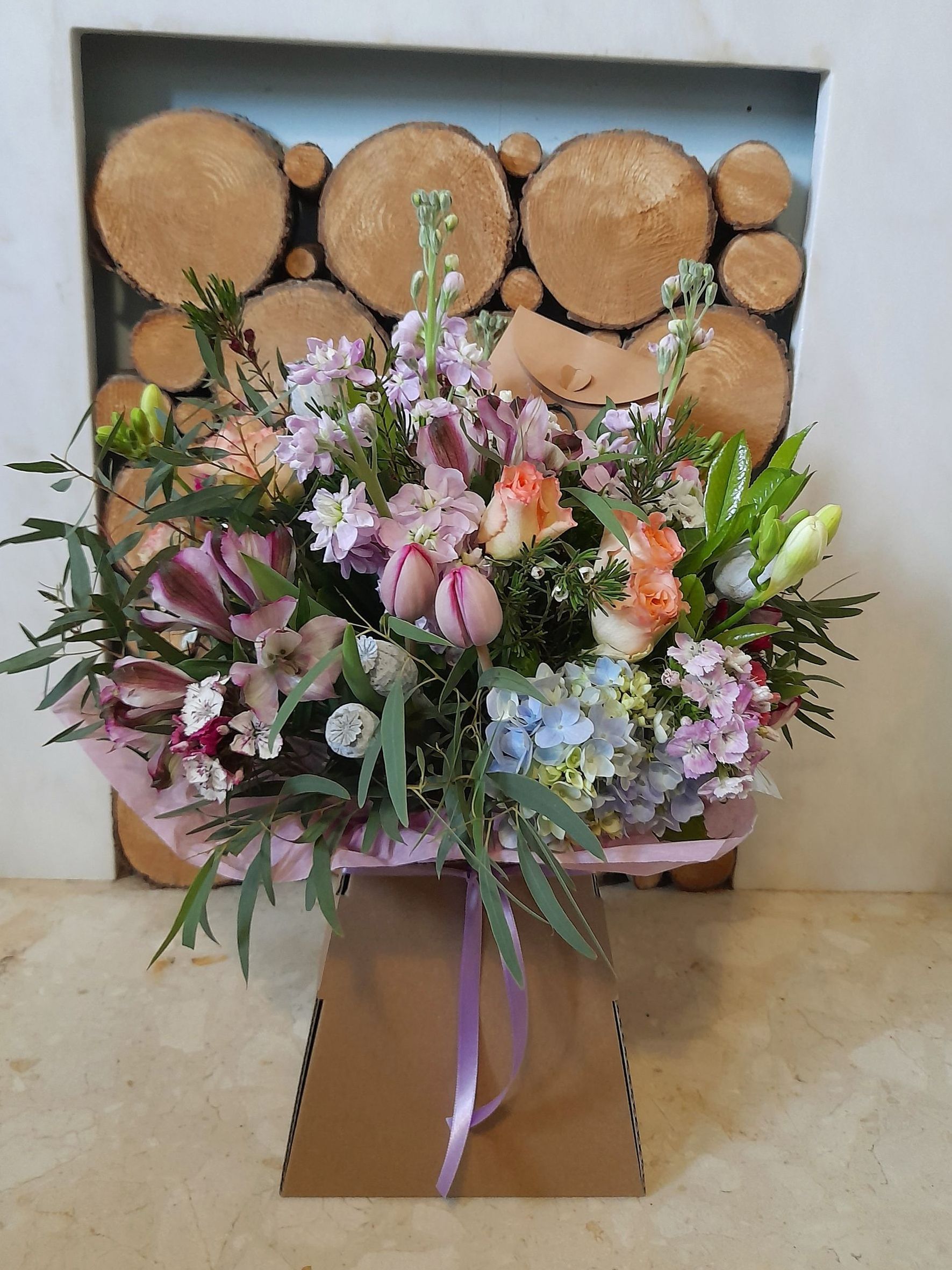 - Floral bouquets are wrapped in a water bubble and placed in a gift box with a selected ribbon.