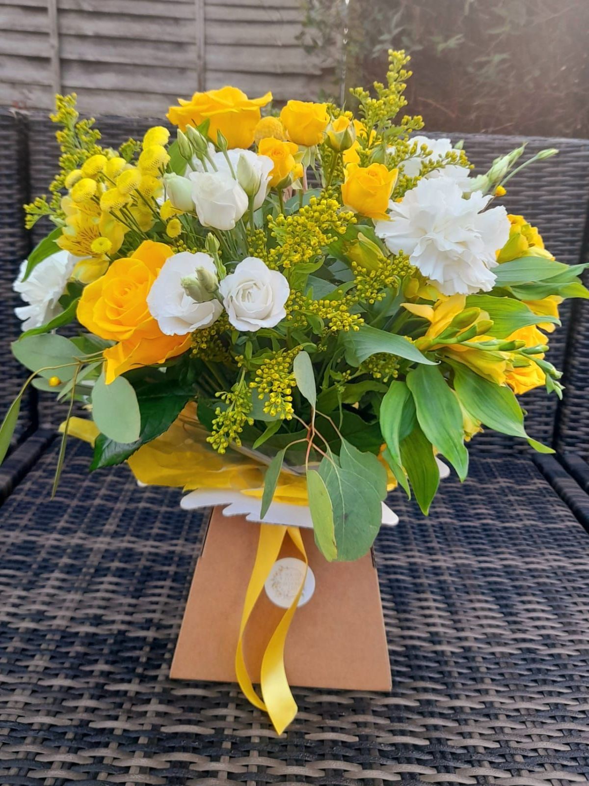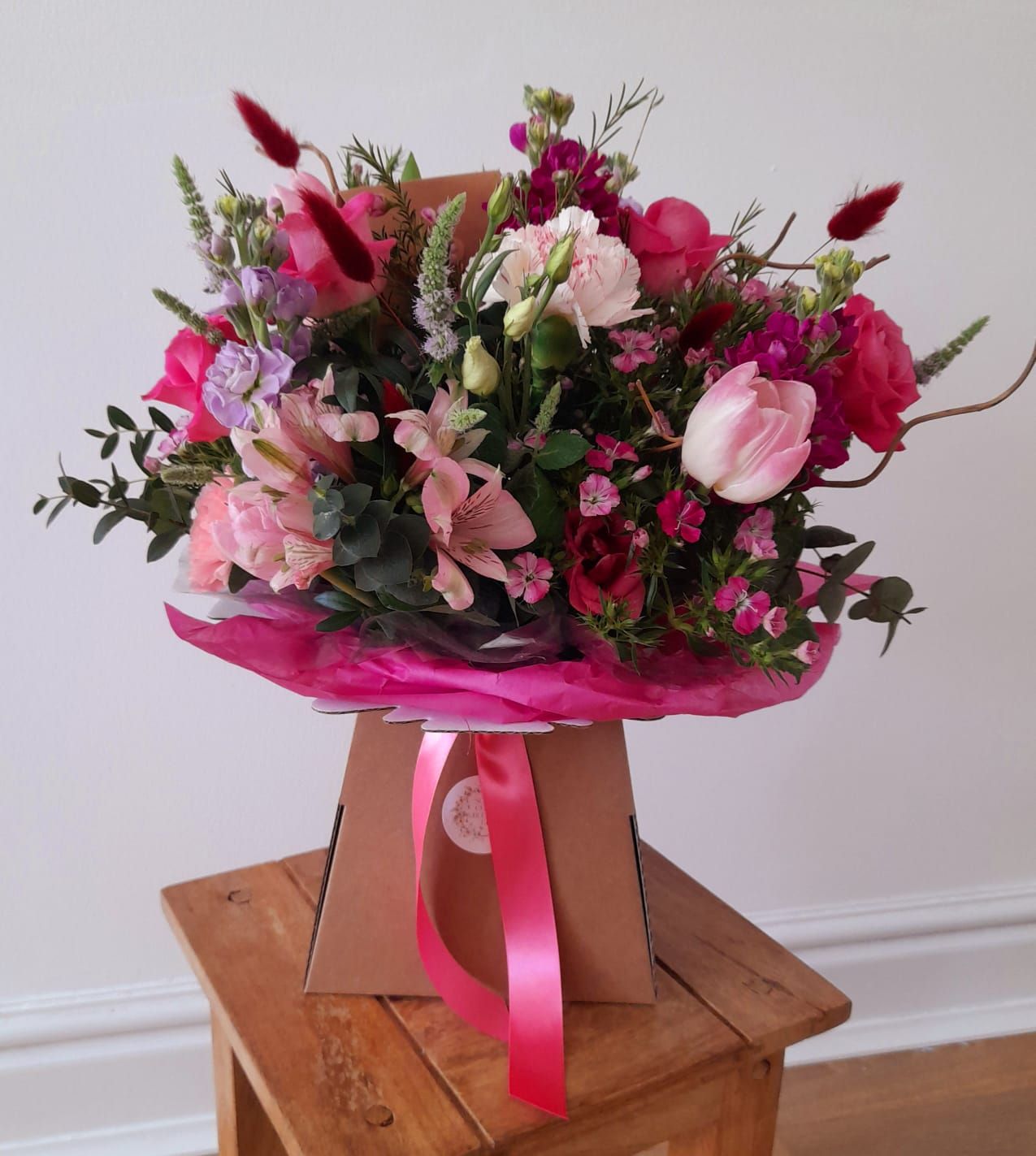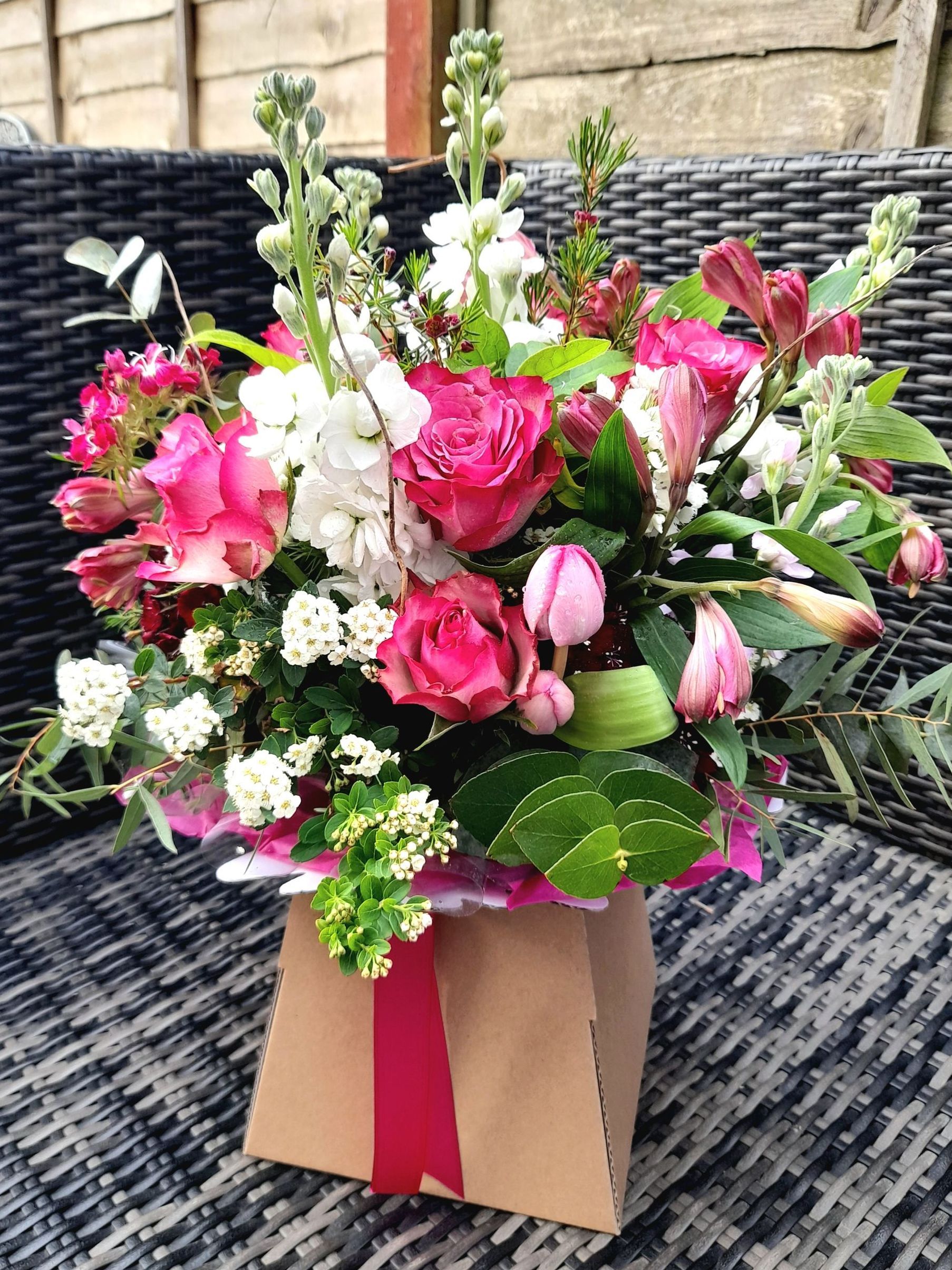 - Floral bouquets are wrapped in a water bubble and placed in a gift box with a selected ribbon.