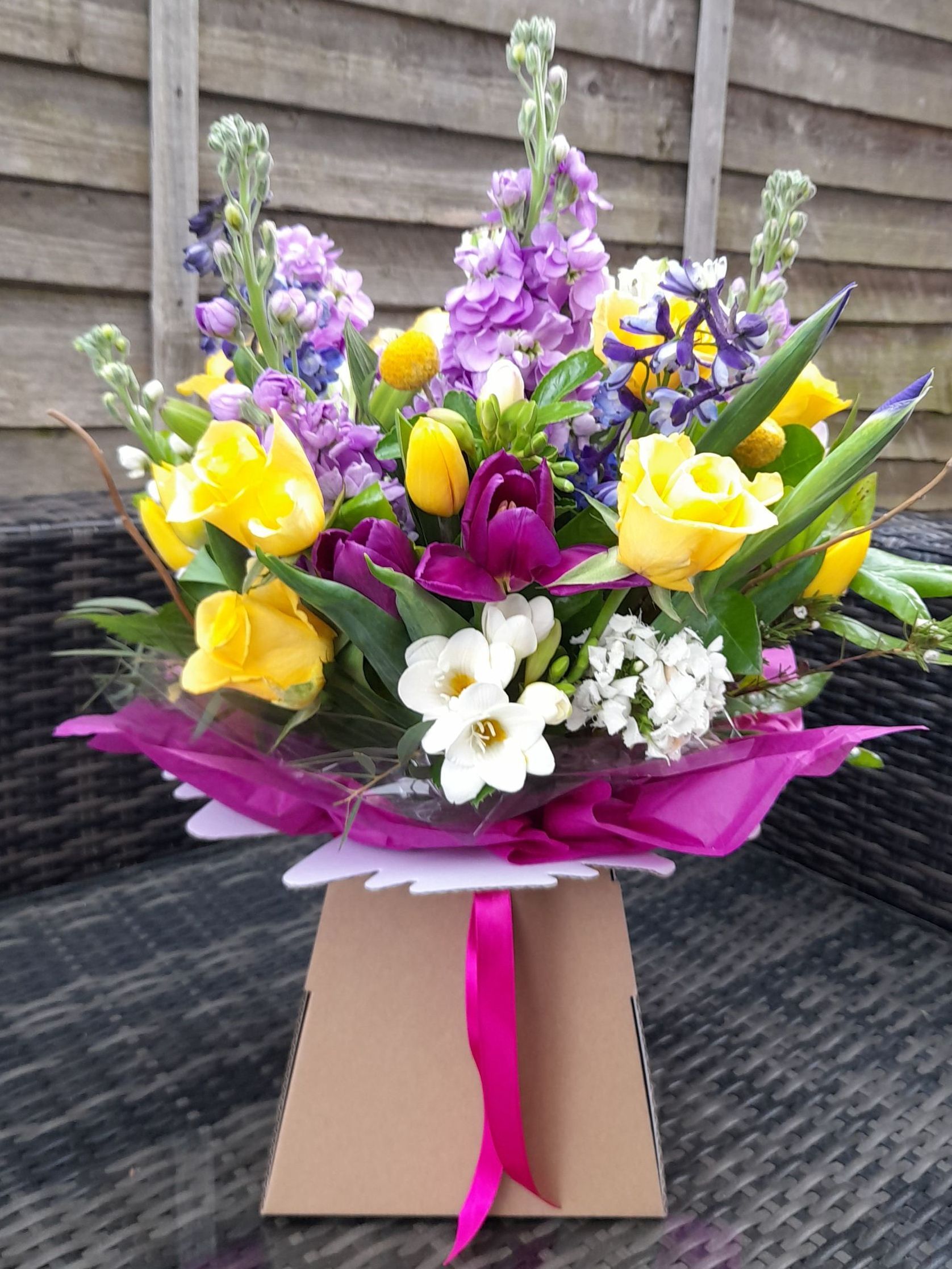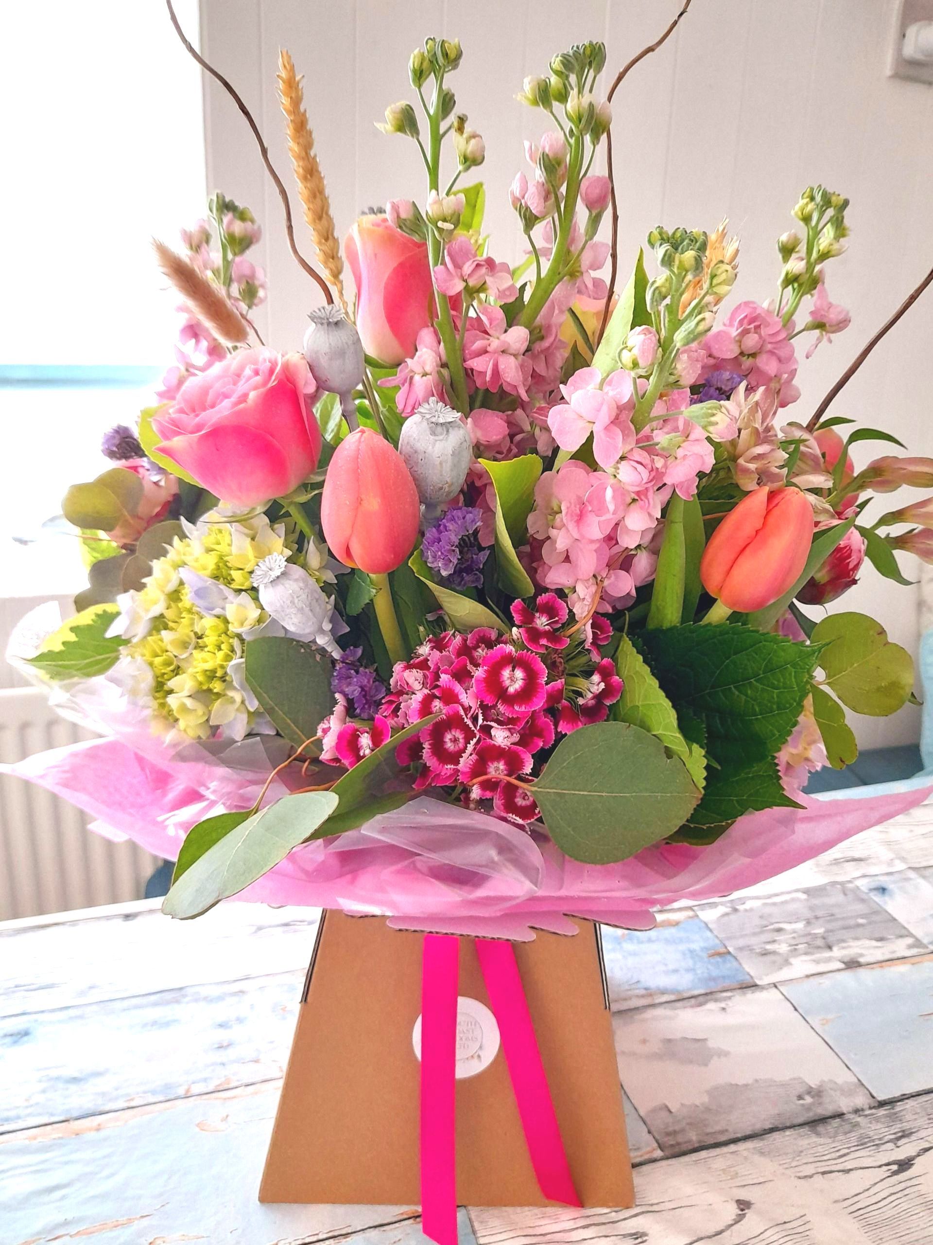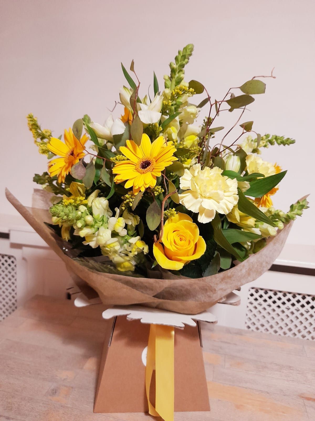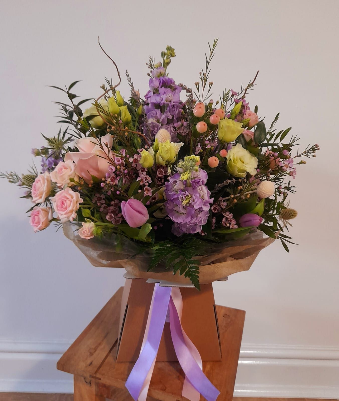 - Pretty hand tied bouquets are wrapped in brown paper and tied with coloured ribbon as a finishing touch.